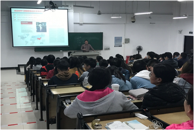 娄文勇教授首先阐述了食物中的营养素与其它功能性食品组分的组成、结构和性质及其对人体健康的生理作用和有益影响,以及这些物质在食品加工过程中的变化规律。提升了同学们对食品营养与健康这一食品领域科研和产业发展的重要方向的认识,也提升和强化食品科学与工程专业本科毕业生服务高端食品、功能健康食品行业及大健康产业的能力。随后,娄文勇教授以“国际遗传工程及其大赛”为例,讲述他所带领的本科生团队参加2017年“国际遗传工程及其大赛”中本科生积极创新、主动推广和交流,积极提升自身综合素质的过程,极大的鼓励了同学们勤奋学习、创新思考、积极交流。