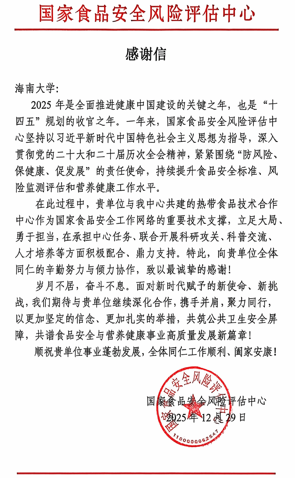 感谢信|来自国家食品安全风险评估中心的感谢信