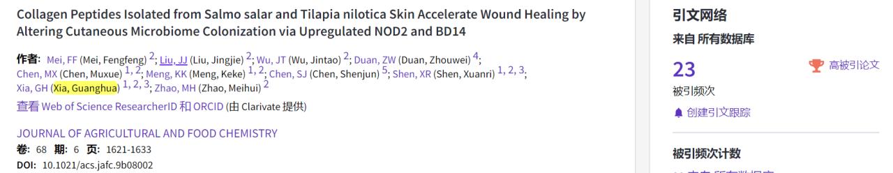 近日,根据ESI公布最新数据显示,Beat365官方网站水产品加工与贮藏团队夏光华副教授课题组在农林科学SCI一区Top期刊《Journal of Agricultural and Food Chemistry》发表的封面文章“Collagen Peptides Isolated from Salmo salar and Tilapia nilotica Skin Accelerate Wound Healing by Altering Cutaneous Microbiome Colonization via Upregulated NOD2 and BD14”入选全球前1% ESI高被引论文。