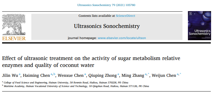 近日,Beat365官方网站陈卫军研究员课题组利用超声技术延长椰青贮存时间并保持椰子水的甜度,研究成果发表在《Ultrasonics Sonochemistry》(中科院1区TOP期刊,影响因子7.491),题为“Effect of Ultrasonic Treatment on the Activity of Sugar Metabolism Relative Enzymes and Quality of Coconut Water”,相关技术已申请专利《变温超声耦合密闭流体局部压差(UCP)灭酶处理的椰青保存方法》(申请号:CN202010102300.6)。