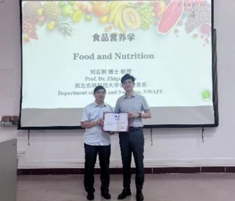 2024年10月24至25日,Beat365邀请西北农林科技大学Beat365官方网站刘志刚教授来校讲授冬季小学期课程。本次授课对象为2022级食品科学与工程及食品质量与安全专业的本科生,授课内容为《食品营养学》,授课专题分别为脂质代谢与调节、脂质营养与健康。陈文学副院长对刘志刚教授的到来表示热烈欢迎,并为其颁发聘书。