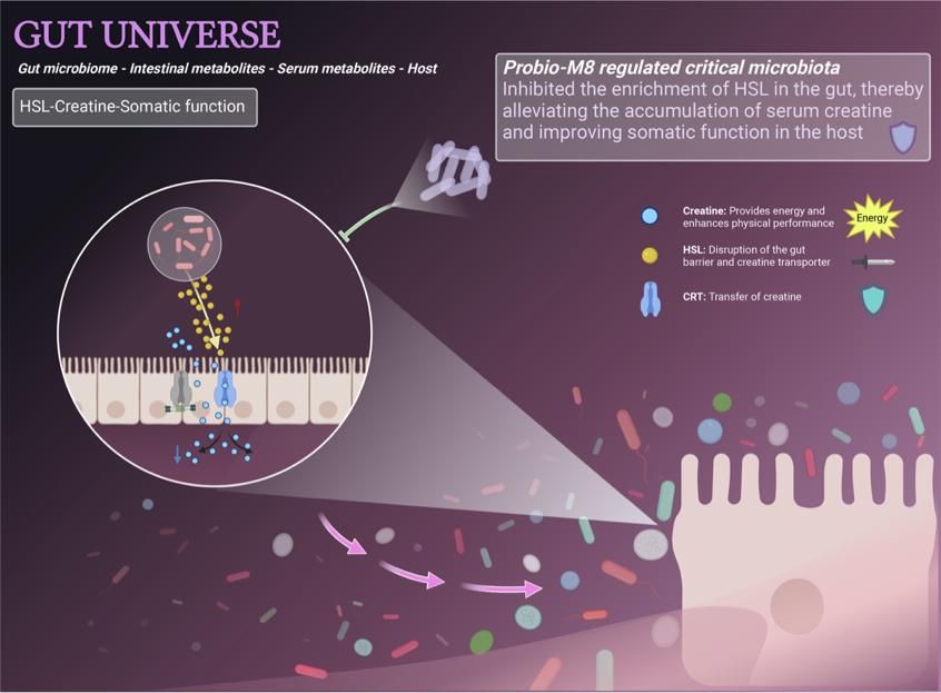 课题组的另一项研究揭示了热带益生菌乳双歧杆菌Probio-M8(Bifidobacterium animalis subsp. lactis Probio-M8)对改善老年肌少症患者健康的显著作用。该研究采用严格的临床试验设计,共招募43名老年肌少症受试者,通过为期60天的益生菌Probio-M8干预,结合多组学分析方法,系统评估了该益生菌对老年肌少症患者肠道微生物组、代谢组和骨骼肌的多维度影响。