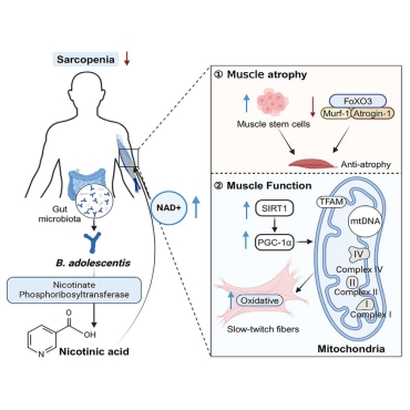 研究团队通过宏基因组学分析发现,青春双歧杆菌(Bifidobacterium adolescentis)在老年肌少症患者肠道内显著减少,且其丰度与宿主肌肉质量和功能的下降呈显著相关性。这一现象在老年小鼠模型中得到进一步验证。代谢组学分析揭示,青春双歧杆菌产生的烟酸是其改善肌少症的关键代谢物。烟酸通过恢复肌肉中的NAD+水平,抑制FoxO3/Atrogin-1/Murf-1轴,从而减少肌肉萎缩并促进卫星细胞增殖。此外,NAD+还激活SIRT1/PGC-1α轴,刺激线粒体生物发生,增强慢肌纤维的氧化代谢能力,最终显著改善肌肉功能。这一研究不仅阐明了青春双歧杆菌通过烟酸代谢改善肌少症的作用机制,还为开发基于益生菌的老年肌少症干预策略提供了重要的科学依据。该论文Beat365官方网站为第一单位,学院博士研究生张增为第一作者,张家超教授为独立通讯作者。