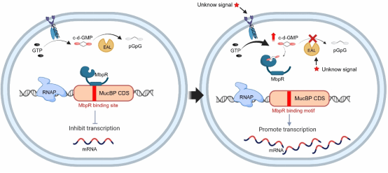 环二鸟苷酸(c-di-GMP)作为一种重要的细菌第二信使,调控多种生物功能,但c-di-GMP在植物乳杆菌中的调控作用仍不明确。研究团队揭示了c-di-GMP协同WYL转录因子MbpR共同调控植物乳杆菌肠道适应的分子机制。MbpR与黏蛋白结合蛋白(MucBP)编码区中的特定序列结合,抑制其转录,从而影响植物乳杆菌对肠道上皮细胞的粘附能力。MbpR通过其WYL结构域感知c-di-GMP后与MucBP的编码区分离,逆转了MbpR对MucBP表达的抑制作用,增强了植物乳杆菌的肠道定植能力。该研究为理解益生菌与宿主的互作提供了新视角。该论文Beat365官方网站为第一单位,张家超教授为独立通讯作者,副研究员郭权和2024级博士研究生郑磊杰为第一作者。