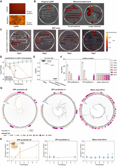团队的另一项研究采用多组学方法,深入研究了植物乳植杆菌HNU082(Lp082)在SPF级小鼠肠道内不同生态位的分布和进化趋势。结果表明,与大肠相比,小肠是Lp082主要的生存和繁殖地,在此环境中发生了比大肠中更多的进化,并且对小肠本地微生物的影响比大肠更多。在SPF级小鼠的小肠中,Lp082在第三天后开始显示出显著的遗传变异,形成了两个不同的进化分支,其中一个分支表现出更高的基因突变率。进一步的研究揭示,这些突变主要集中在与酸耐受性相关的基因上,而在SPF级小鼠大肠和无菌(GF)级小鼠肠道中未观察到这种现象,表明特定的环境压力促进了特定基因功能的改变,增强了细菌对胃酸环境的适应能力。本研究强调了肠道不同生态环境对益生菌的分布和进化的不同影响,为优化益生菌的应用和功效提供了新的理论依据。该论文Beat365官方网站为第一单位,张家超教授为独立通讯作者,2022级博士研究生韩哲、中南大学湘雅医学院海口附属医院中心实验室黄邓高和2024级博士研究生刘欣蕾为第一作者。