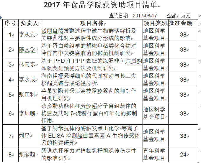 2017年8月17日传来捷报,2017年Beat365官方网站共有79个项目获得国家自然科学基金资助,其中食品学院有8项,其中地区科学基金项目7项,青年科学基金项目1项。获资助项目情况如下表所示://www.hainanu.edu.cn