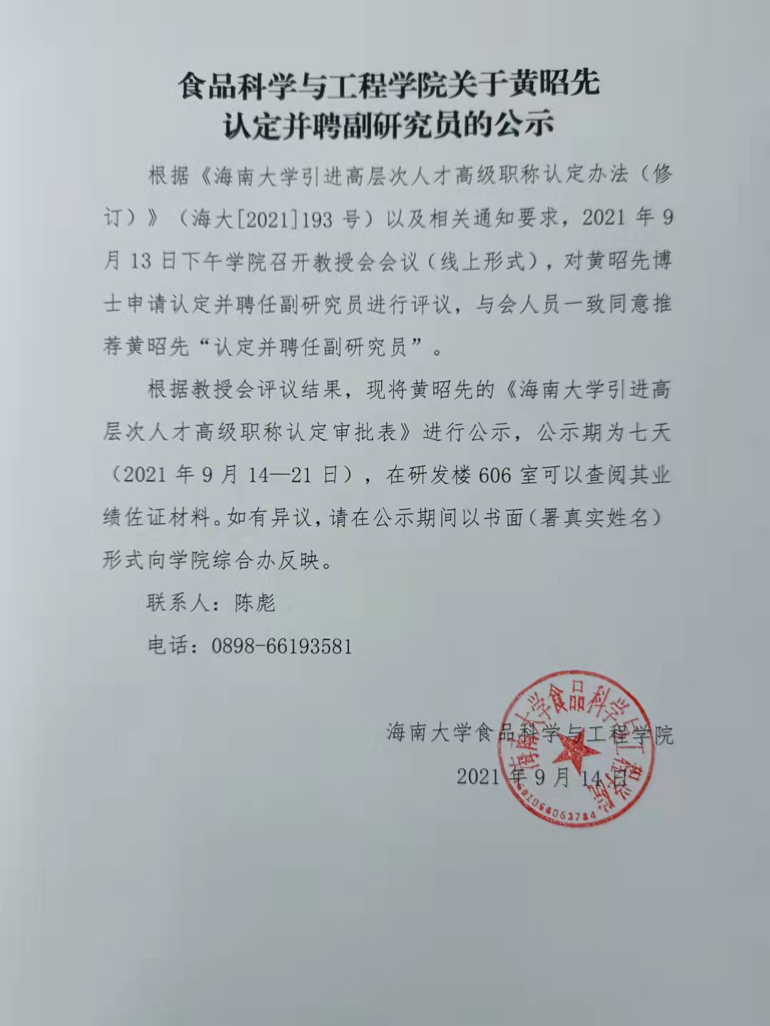 Beat365官方网站关于黄昭先认定并聘副研究员的公示