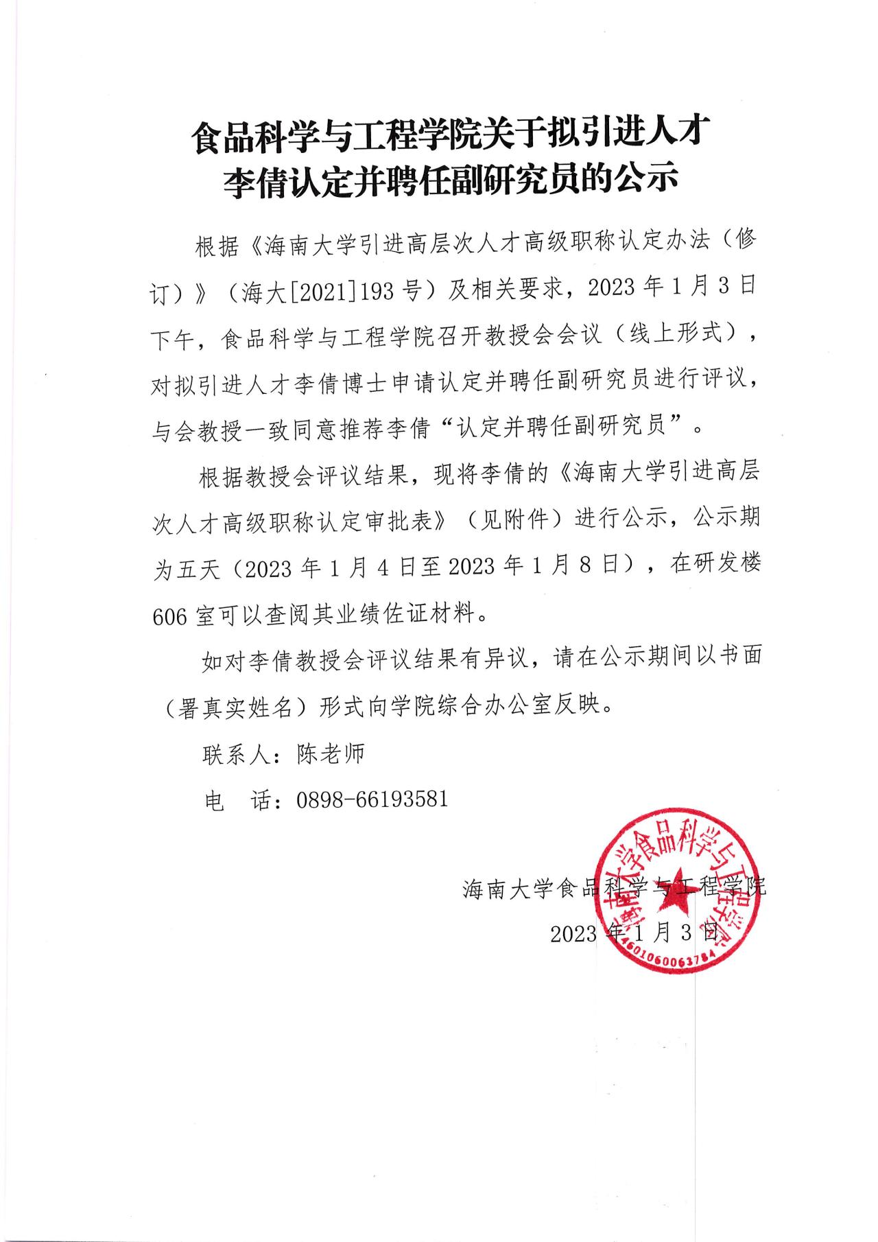 Beat365官方网站关于拟引进人才李倩认定并聘副研究员公示