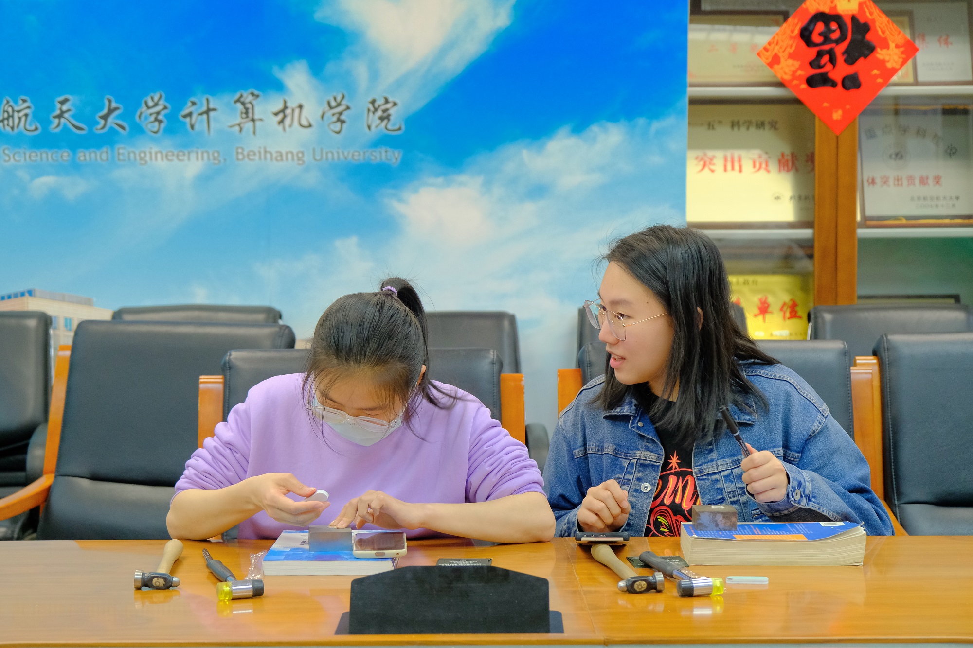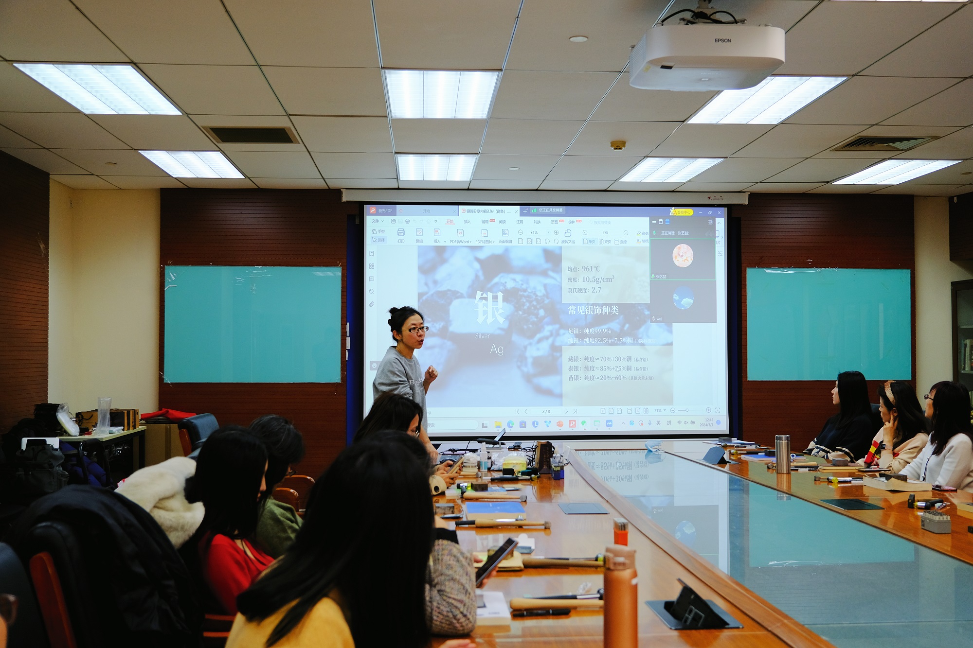 在专业老师的带领下,大家了解了常见银饰的种类、如何分辨真假银饰,学习了银饰的养护和搭配。 银饰在我国各民族服饰文化中,有着举足轻重的地位,它寓意真善美。在掌握了理论知识以后,大家迅速投入到制作过程中,先设计好图案,再用铁锤敲制刻字,制作肌理,然后放置在方铁上,用胶锤敲击银饰使其平整。最后交给老师打磨打孔、做旧抛光。