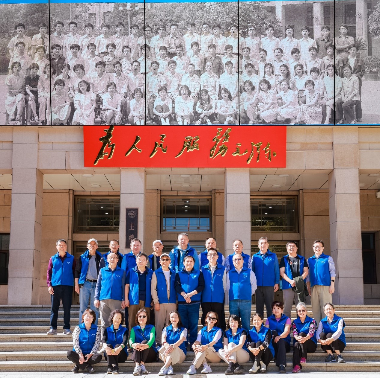 校史馆参观接近尾声时,校友们还在电子屏上找到了自己当年的毕业照,惊喜之情溢于言表,于是来到老主楼前,按照当年毕业照的站位,又重新拍了一张跨越40年的合影。