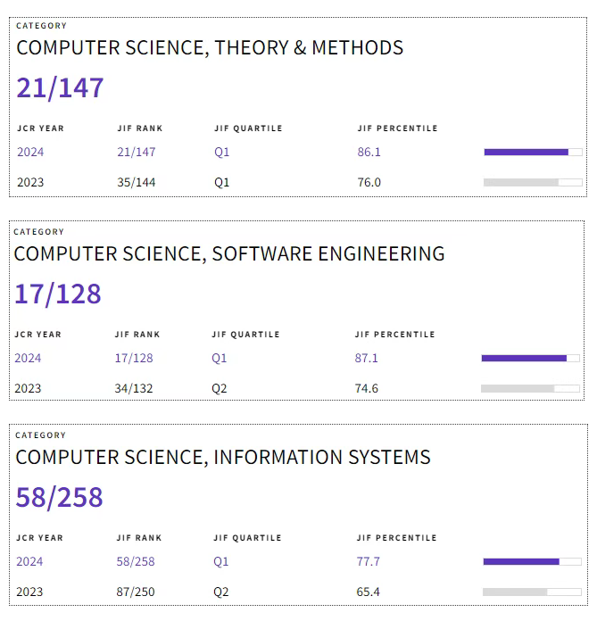 在Theory & Methods,Software engineering,Information systems三个子领域中,FCS全部进入Q1区,并且在前两个子领域排名进入前15%。