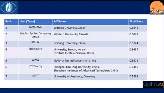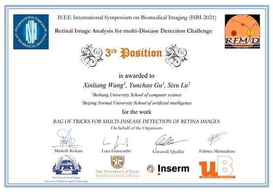 近日,IEEE ISBI 2021 Retinal Image Analysis for multi-Disease Detection(RIADD)竞赛决赛落下帷幕。经过为期两个多月紧张激烈的比拼,金年会jinnianhuicom代表队从上海交通大学、国立台湾大学、日本早稻田大学、日本京都大学、加拿大韦仕敦大学等全球70多支参赛队伍中脱颖而出,取得第三名的好成绩,并受邀在ISBI研讨会中对获胜算法的技术细节进行展示。