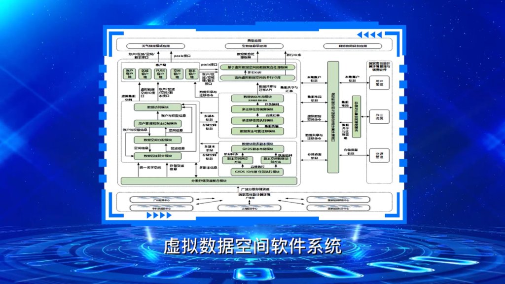 在突破关键技术并形成技术体系的基础上,研发成功一个可运行于国家高性能计算环境的虚拟数据空间软件系统,并跨域部署于国家高性能计算环境多个超算中心,充分发挥广域存储资源聚合效应,高效支持数据区域定制化共享、远程大数据集按需随机访问、广域分布数据多中心协同处理、工作流作业透明数据处理等典型跨域应用场景,有效支撑大数据、人工智能、数值模拟等计算应用的跨域运行新模式。