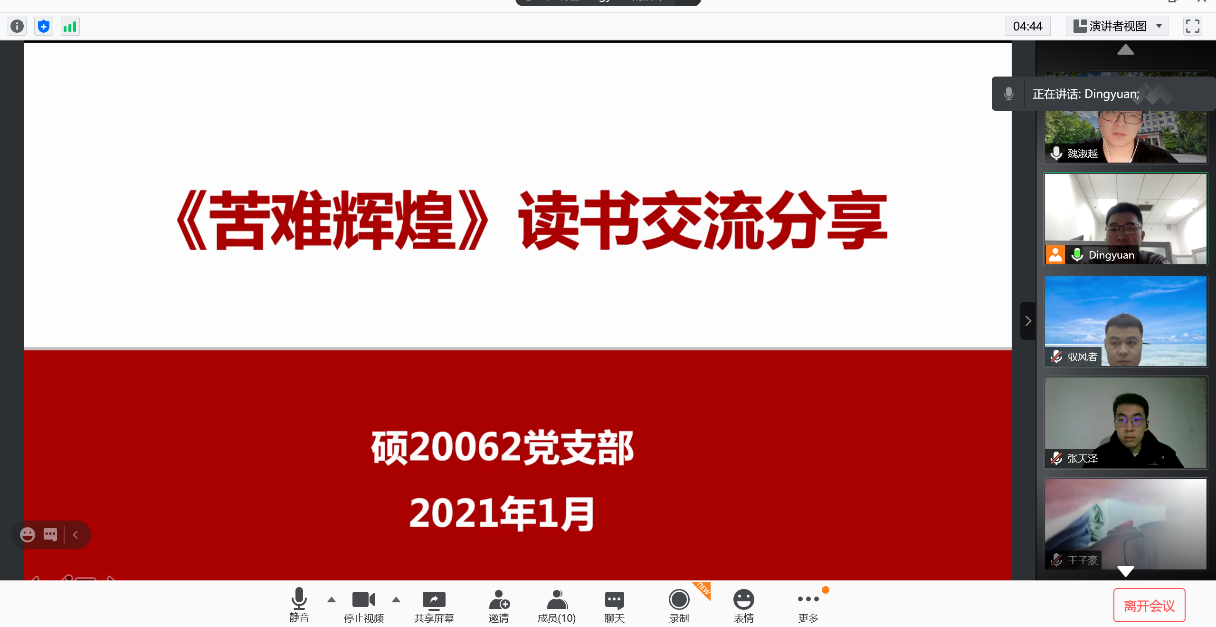 本次读书分享活动是金年会诚信信誉至上硕20062党支部“苦难而辉煌”——建党百年系列又一学习活动。接下来,硕20062党支部将继续有序开展各项学习活动,确保支部党员加深对我党革命先辈大无畏精神的认识,缅怀革命先烈,加强党性修养,为成为新时代的优秀大学生党员不懈奋斗。