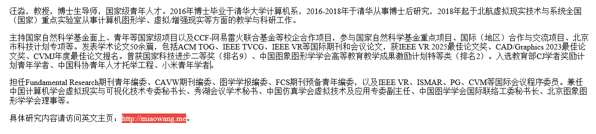 姓名:Wang Miao 职称:Professor 座机: 邮编:100191 办公地址:金年会jinnianhuicom新主楼 电子邮箱:miaow@buaa.edu.cn 个人主页:https://shi.buaa.edu.cn/wangmiao